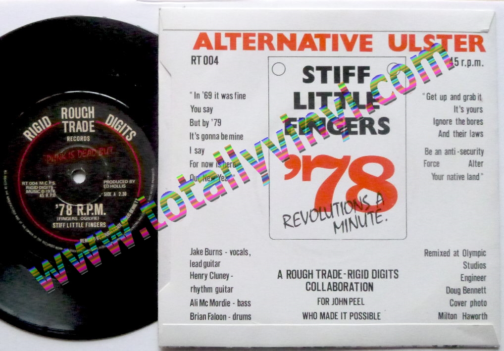 78 RPM / Alternative Ulster by Stiff Little Fingers UK Rigid Digits/Rough Trade RT 004 stereo 7 inch Cover Variant A Label Variant A=78rpm Matrix Variant A/B Picture Cover 80s Rock Punk.