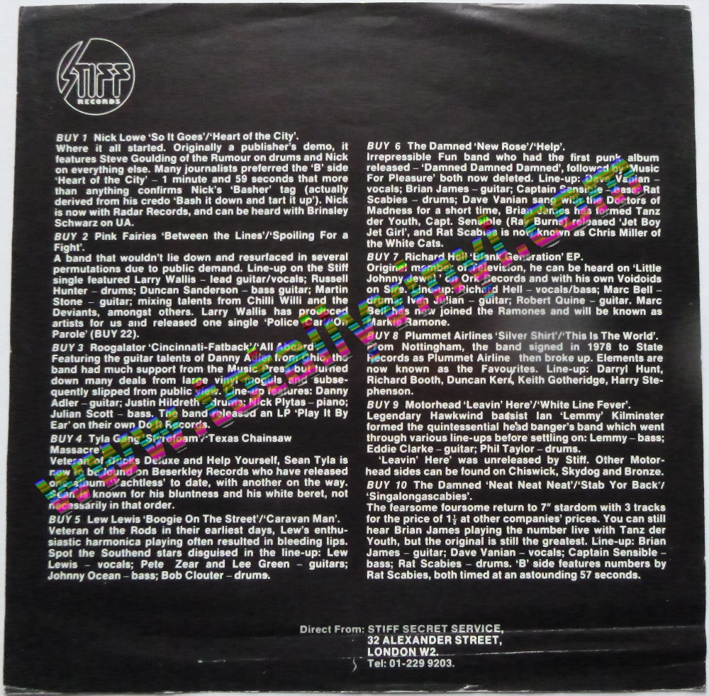 Stiff single by Various Artists (Nick Lowe/Pink Fairies/Roogalator/Tyla Gang/Lew Lewis/The Damned/Richard Hell/Plummet Airlines/Motorhead) UK Stiff Records N/A Insert Memorabilia 70s Punk New Wave Pop Rock.