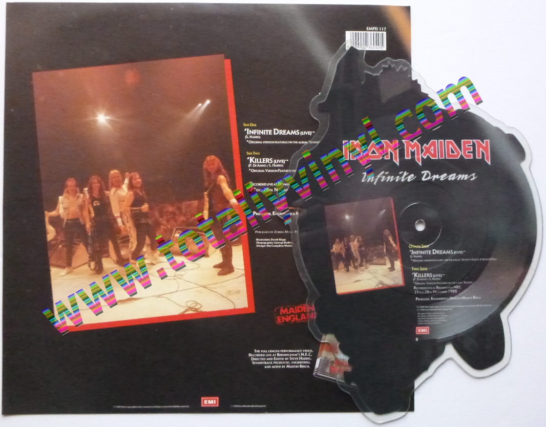 Infinite dreams (live) / Killers (live) by Iron Maiden UK EMI EMP 117 Stereo 7 inch Insert Picture Disc Shaped Heavy Metal 80s Rock.