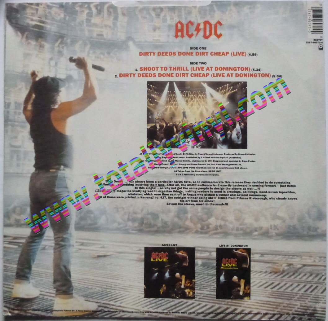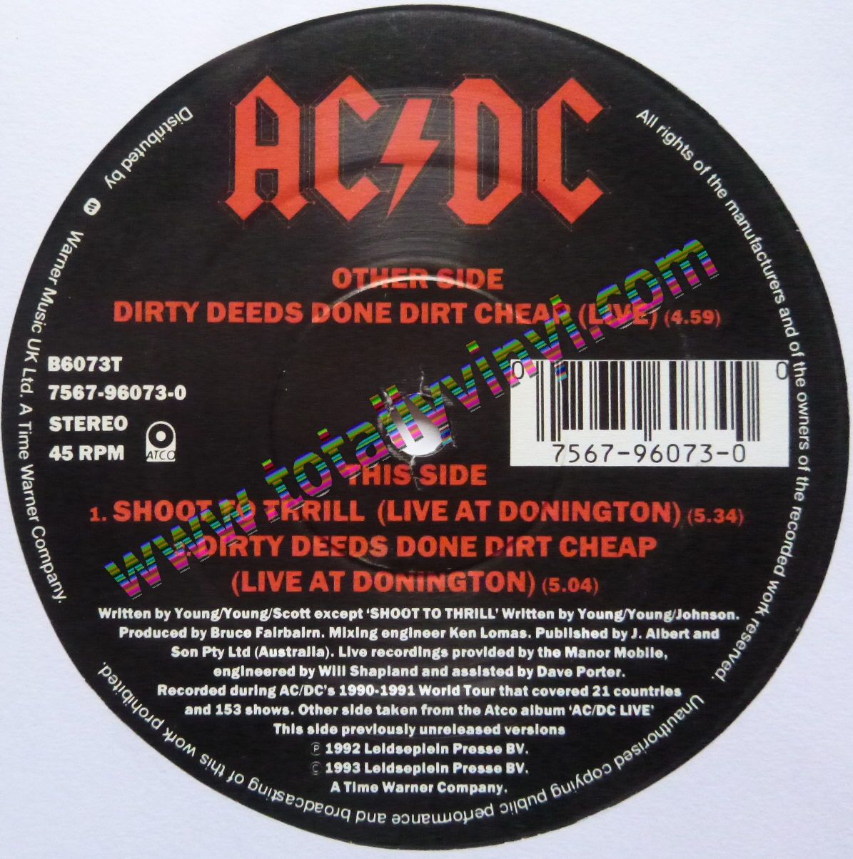 Dirty deeds done dirt cheap (live-4.59) / Shoot to thrill (live at Donnington-5.34) / Dirty deeds done dirt cheap (live at Donnington-5.04) by AC~DC UK Atco B6073T Stereo 12 inch Picture Cover 80s Rock Heavy Metal 90s 70s.