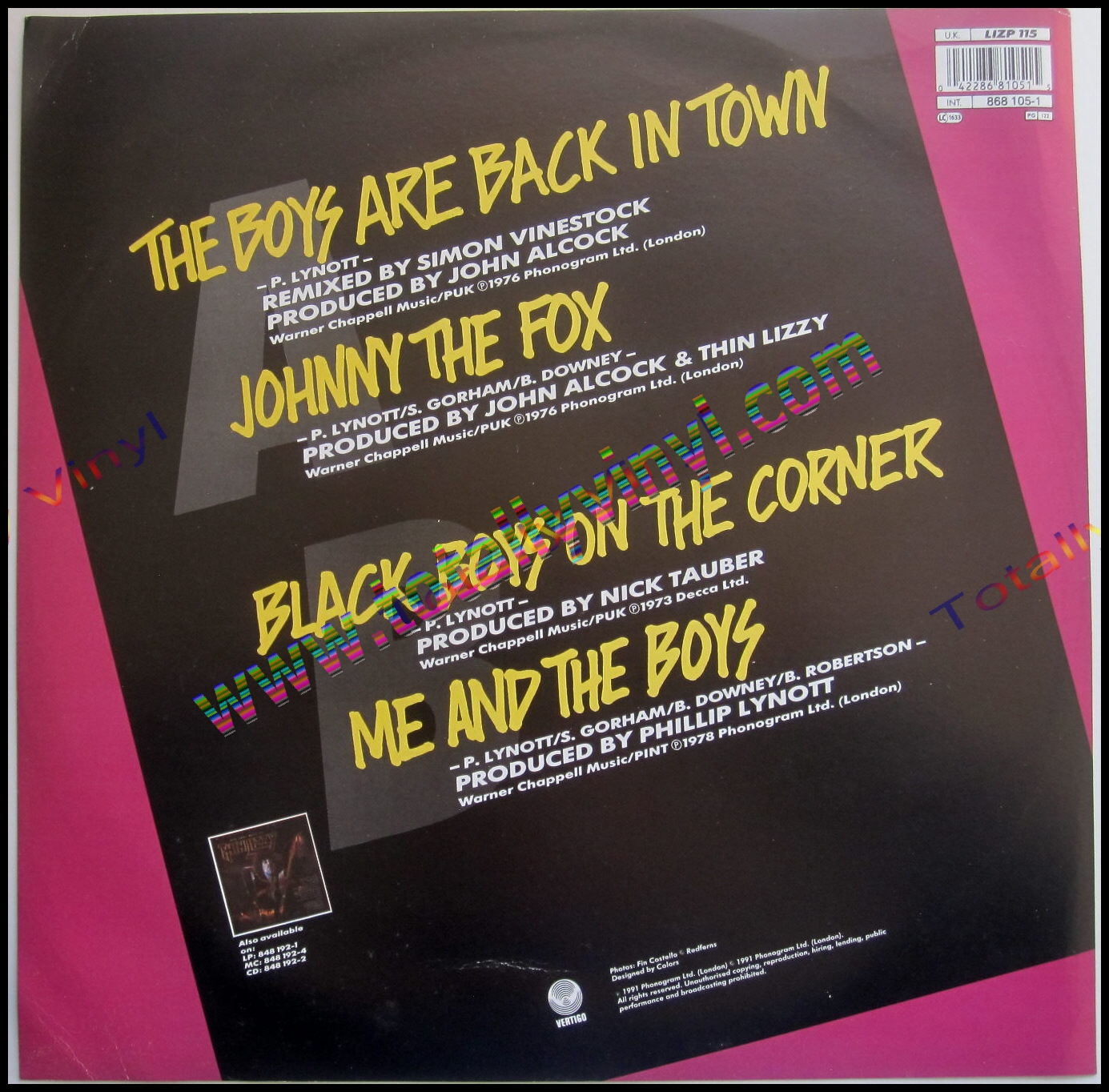 The boys are back in town / Johnny the fox / Black boys on the corner / Me and the boys by Thin LIzzy UK Vertigo LIZP 115 Stereo 12 inch Insert Picture Disc Sticker 70s Rock.